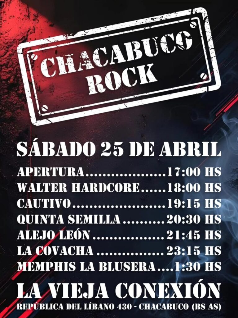 Este sábado 25 de abril, desde las 17:00 hs, nuestra ciudad será el epicentro de una jornada cargada de música con la edición del festival Chacabuco Rock. El encuentro tendrá lugar en La Vieja Conexión (República del Líbano 430), un espacio que se prepara para recibir a fanáticos del rock de toda la zona.